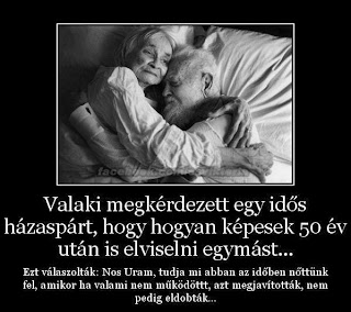 Valaki megkérdezett egy idős házaspárt, hogy hogyan képesek 50 év után is elviselni egymást. Ezt válaszolták: Nos, Uram, tudja mi abban az időben nőttünk fel, amikor ha valami nem működött, azt megjavították, nem pedig eldobták.